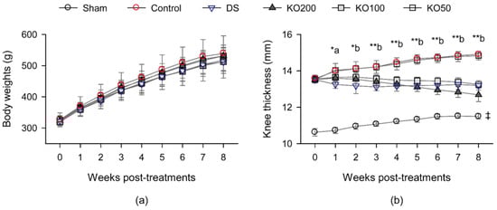 Changes in body weight and knee thickness in vivo. (a) Body weight. (b) Knee thickness. Values are expressed as the means ± SDs in eight sample sizes. ‡: p < 0.01, compared to the sham; a *: p < 0.05, in the DS and KO200 groups compared to the osteoarthritis rat model control (control); b **: p < 0.01 and b *: p < 0.05, in the DS, KO200, and KO100 groups compared to the control.
