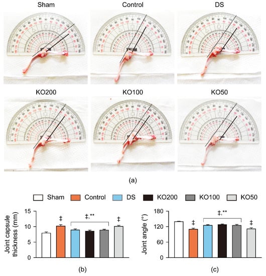 Following all treatments, the thickness of the knee joint capsule exposed from the surrounding tissues was directly measured, and the maximum extension angle of the joint was assessed (Figure 3). Joint capsule swelling and stiffness were evident in the OA control, while they were mild in the DS and KO treatment groups (Figure 3a). Indeed, the thickness of the joint capsule was increased in the OA control compared to the sham (p < 0.01); however, it was significantly reduced in the DS, KO200, and KO100 groups compared to the OA control (p < 0.01, Figure 3b). The maximal extension angle was reduced in the OA control compared to the sham (p < 0.01); however, it was increased in the DS, KO200, and KO100 compared to the OA control (p < 0.01, Figure 3c).