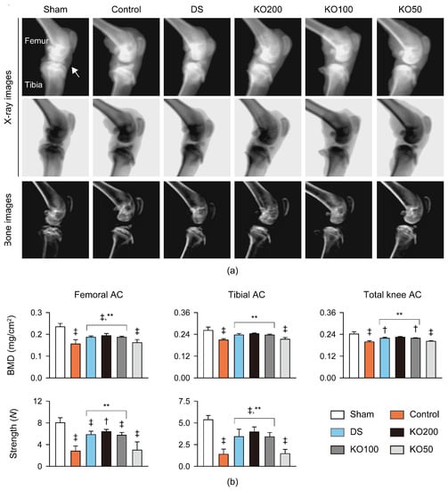 Bone mineral density (BMD) was analyzed in the articular cartilages using live dual-energy X-ray absorptiometry (DEXA) images, and the comprehensive strength was measured (Figure 4). In DEXA images, joint capsule swelling, erosive cartilage degradation, and osteophyte formation were severe in the OA model control; however, they were attenuated in the DS and KO treatment groups (Figure 4a). In the total and each of the femoral and tibial articular cartilages, BMD was reduced in the OA control compared to the sham (p < 0.01); however, it was increased in the DS, KO200, and KO100, compared to the OA control (p < 0.01, Figure 4b). The comprehensive strength of both femoral and tibial articular cartilages was reduced in the OA control compared to the sham (p < 0.01); however, it was increased in the DS, KO200, and KO100, compared to the OA control (p < 0.01).