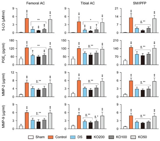 The activities of 5-LO and levels of PGE2, MMP-2, and MMP-9 in the femoral and tibial articular cartilages and the synovial membranes including infrapatellar fat pads, were increased in the OA control compared to the sham (p < 0.01); however, they were significantly reduced in the DS, KO200, and KO100 compared to those of the OA control (p < 0.05, Figure 5). In particular, the 5-LO activity in the synovial membrane/infrapatellar fat pad was reduced more in the KO200 than in the DS (p < 0.05).