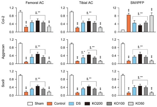 Gene expressions of Col-2, aggrecan, and Sox9 in the femoral and tibial AC and the SM/IPFP. Values are expressed as the means ± SDs in eight sample sizes. ‡: p < 0.01, compared to the sham; **: p < 0.01 and *: p < 0.05, compared to the control.