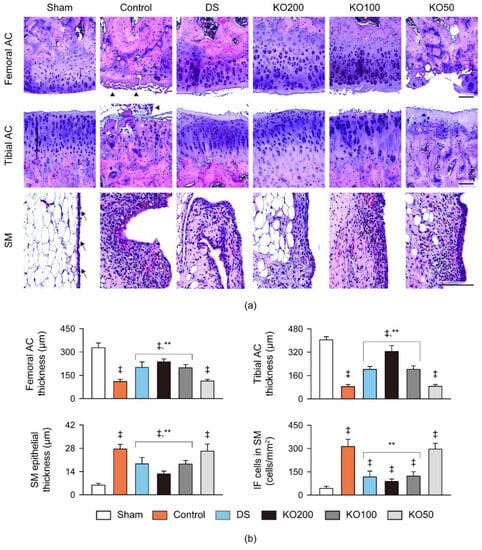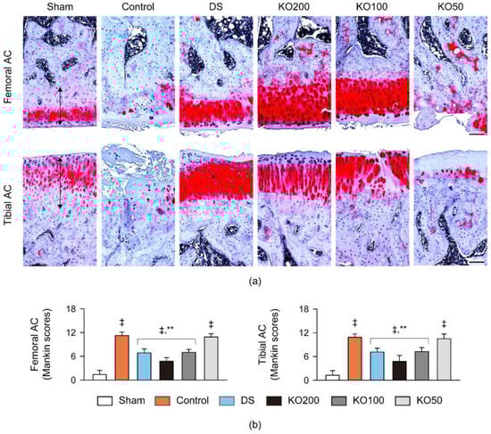 Histopathological changes were examined in the joint cartilages and synovial membrane/infrapatellar fat pad stained with hematoxylin and eosin (HE) and Safranin O (Figure 7 and Figure 8). In HE stains, thin cartilage layers and severe cartilage degradation were evident in the femoral and tibial articular surfaces of the OA control, along with thick synovial membrane-lining epithelium and the marked inflammatory cell infiltration (Figure 7a). However, the histopathological changes were attenuated in the DS and KO treatment groups. The thickness of the femoral and tibial articular cartilages was reduced in the OA control compared to the sham (p < 0.01); however, it was increased in the DS, KO200, and KO100 compared to the OA control (p < 0.01, Figure 7b). Conversely, the synovial membranes-lining epithelium and inflammatory cell infiltration were increased in the OA control compared to the sham (p < 0.01); however, they were reduced in the DS, KO200, and KO100 compared to the OA control (p < 0.01). Additionally, in the KO200 compared to the DS, the thickness of both cartilages was increased more, while the thickness of the synovial membrane-lining epithelium was reduced more (p < 0.05). In Safranin O stains, the OA control group exhibited evident cartilage injuries with reduced chondrocytes, clone formation, and stain intensity in the femoral and tibial surfaces; however, the changes were mild in the DS and KO treatment groups (Figure 8a). The Mankin scores in both articular cartilages were increased in the OA control compared to the sham (p < 0.01). However, the scores were significantly reduced in the DS, KO200, and KO100 compared to the OA control, and further reduced in the KO200 compared to the DS (p < 0.01, Figure 8b).
