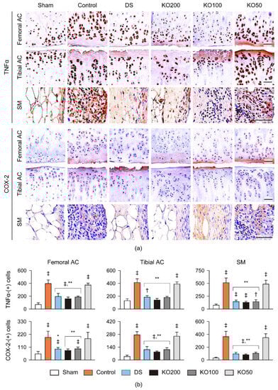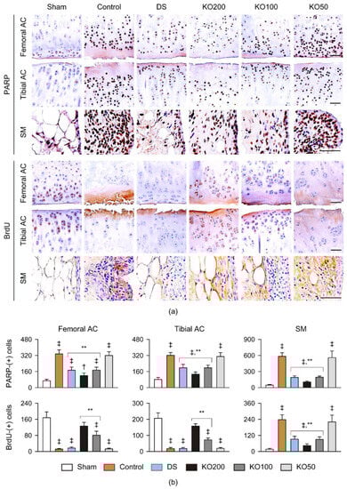 The femoral and tibial articular cartilages and the synovial membrane/infrapatellar fat pad were immunostained for tumor necrosis factor (TNF)α and cyclooxygenase (COX)-2 as markers of inflammation, cleaved poly (ADP-ribose) polymerase (PARP) as a marker of apoptosis, and bromodeoxyuridine (BrdU) as a marker of cell proliferation (Figure 9 and Figure 10). The immunostains for TNFα, COX-2, and PARP were evident in both articular cartilages and the synovial membrane/infrapatellar fat pad in the OA control; however, they were attenuated in the regions of the DS and KO treatments (Figure 9a and Figure 10a). The immunostain for BrdU differed between the articular cartilages and synovial membranes in the OA control, with little stains and pronounced stains, respectively (Figure 10a). However, the immunostains were reversed in the regions of the DS and KO treatment groups. The number of immunoreactive cells for TNFα, COX-2, and PARP were increased in both articular cartilages and the synovial membranes of the OA control compared to those of the sham (p < 0.01); however, they were significantly reduced in the regions of the DS, KO200, and KO100 groups compared to those of the OA control (p < 0.05, Figure 9b and Figure 10b). In particular, the PARP-immunoreactive cells were reduced more in the KO200 than in the DS (p < 0.01). The BrdU-immunoreactive cells were reduced in both articular cartilages of the OA control to the sham (p < 0.01); however, they were significantly increased only in the cartilages of the KO200 and KO100 compared to those of the OA control (p < 0.01, Figure 10b). Conversely, the immunoreactive cells in the synovial membranes were increased in the OA control to the sham (p < 0.01); however, they were significantly reduced in the DS, KO200, and KO100 compared to the OA control (p < 0.01).