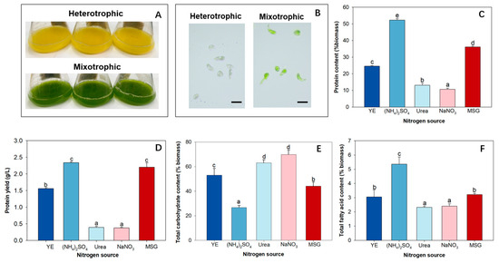 - Cai, Y.; Zhai, L.; Fang, X.; Wu, K.; Liu, Y.; Cui, X.; Wang, Y.; Yu, Z.; Ruan, R.; Liu, T. Effects of C/N ratio on the growth and protein accumulation of heterotrophic Chlorella in broken rice hydrolysate. Biofuels Bioprod. 2022, 15, 102. [Google Scholar] [CrossRef] [PubMed]