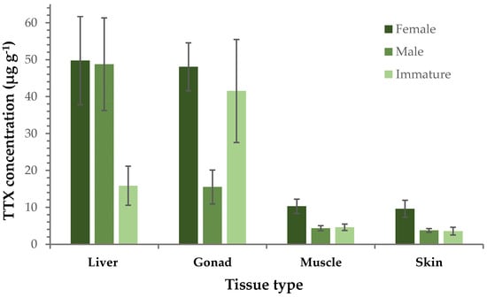 A further comparison between female, male and immature specimens (i.e., individuals that did not have fully developed reproductive organs and could not be categorized as male or female) was performed, focusing on TTX concentrations of the different tissues. This investigation revealed that female liver and gonads had an almost 5 times higher TTX concentration compared to muscle and skin. A similar pattern was observed for males, although TTX levels in gonads were only 3-fold higher than those in muscle and skin. With regard to immature specimens, the stronger presence of TTX in gonads than any other tissue type was their main characteristic. In general, the concentration of TTX in muscle and skin samples was almost identical and this homogeneity was consistently evident in all three sex groups. More interestingly, the TTX levels in females were considerably higher than those measured in immature specimens, although the difference in gonads was less pronounced compared to the other tissue types (Figure 2). Furthermore, the TTX content in gonad, muscle and skin of females was nearly three times higher than those of males, whereas comparable concentrations were recorded in the liver tissues of both sex groups.