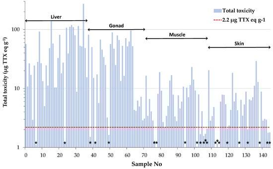 Toxicity assessment of L. sceleratus samples based on the Japanese safety consumption limit of 2.2 μg TTX eq g−1 (red dashed line). Non-toxic samples are marked with black asterisks.