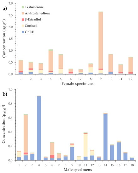 In terms of average concentration, the most abundant hormone was androstenedione (0.23 ± 0.08 μg g−1), followed by GnRH (0.11 ± 0.03 μg g−1) and cortisol (0.06 ± 0.01 μg g−1) (Table 3). The corresponding values of β-estradiol and testosterone were considerably lower and equaled 0.020 ± 0.004 μg g−1 and 0.010 ± 0.002 μg g−1, respectively. The levels of hormones were further investigated in female, male and immature L. sceleratus specimens separately. Results showed that androstenedione dominated in female gonads, with an average concentration of 0.6 ± 0.2 μg g−1 (versus 0.05 ± 0.03 μg g−1 in males), while GnRH was more abundant in male gonads, at a mean concentration of 0.2 ± 0.1 μg g−1 (versus 0.05 ± 0.01 μg g−1 in females), (Table 4, Figure 4). In immature specimens, none of the hormones prevailed, as the mean concentrations of GnRH, cortisol, β-estradiol and androstenedione had similar values, ranging from 0.03 ± 0.02 to 0.06 ± 0.04 μg g−1.