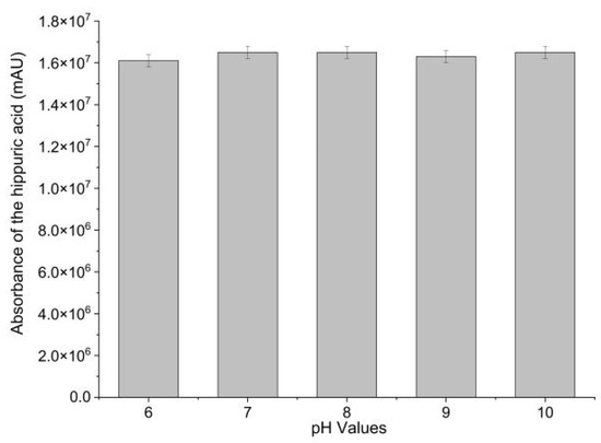 Immobilization efficacy was evaluated by measuring the ACE-inhibitory activity of Sepharose-4B-immobilized ACE. ACE-inhibitory activity of Sepharose-4B-immobilized ACE was determined in different pH (6–10). Hippuric acid (HA), the reaction product, was employed as a measure of ACE-inhibitory activity. As shown in Figure 1, Sepharose-4B-immobilized ACE effectively catalyzed the production of HA from hippuryl-l-histidyl-L-leucine (HHL). This result demonstrated the successful immobilization of ACE with Sepharose 4B as well as the activity of the immobilized biomolecules. The enzyme activity was calculated to be 0.2 U·mL−1 immobilized enzyme. Moreover, no significant difference in ACE-inhibitory activity was observed in sodium borate buffers between pH 6.0 and 10.0, suggesting an increase in pH stability compared to free ACE. In order to fix receptor enzymes, the matrix should have an open structure to prevent interactions between the immobilized enzymes and acceptor molecules [19]. As cyanogen bromide (CNBr) reacts with hydroxyl groups on Sepharose 4B, it forms cyanate esters or imidocarbonates. These groups react readily with primary amines in very mild conditions, resulting in the covalent coupling of ACE to the Sepharose 4B [20]. The coupling procedure is relatively simple and reproducible [21]. Therefore, CNBr-activated Sepharose 4B was shown to be an efficient support for ACE immobilization.