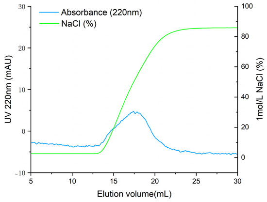 T. flavidus peptides were purified by affinity adsorption to the ACE–Sepharose 4B column. After reaching the adsorption equilibrium, elution was performed with a linear NaCl gradient (0–1 mol·L−1). As shown in Figure 2, the chromatogram of Sepharose 4B without ACE did not show an absorption peak, indicating that active groups of CNBr-activated Sepharose 4B were effectively blocked with glycine. One main elution peak was obtained on the elution curve of ACE–Sepharose 4B with the same experimental manipulation. The eluate was desalted and concentrated and subsequently sequenced by mass spectrometry. As shown in Table 1, 24 peptides with ALC ≥ 80% were identified. These peptides had lengths ranging from 4 to 12 amino acids, with molecular weights ranging from 358.2 to 1207.6 Da.