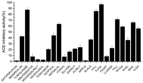 The angiotensin-I-converting enzyme (ACE), a zinc-dependent dipeptidyl carboxypeptidase, plays a vital role in regulating blood pressure [1]. ACE catalyzes the conversion of angiotensin I (Ang I) into angiotensin II (Ang II) in the renin–angiotensin system (RAS) and degrades the vasodilating bradykinin into inactive peptides in the kallikrein–kinin system (KKS). Numerous studies showed that ACE is one of the most important therapeutic targets to control hypertension [2,3]. Therefore, ACE inhibitors have been widely applied in the clinic as effective antihypertensive drugs [4]. However, the most widely prescribed blood-pressure-lowering ACE inhibitors (captopril, enalapril, lisinopril, benazepril, and many others) were almost obtained by chemical synthesis. These drugs usually cause significant undesirable side effects, including low blood pressure, dry cough, headaches, fetal disorder, and an abnormal taste [5]. Hence, the utilization of ACE-inhibitory peptides has increasingly attracted more and more interest because they have fewer side effects and are readily prepared.