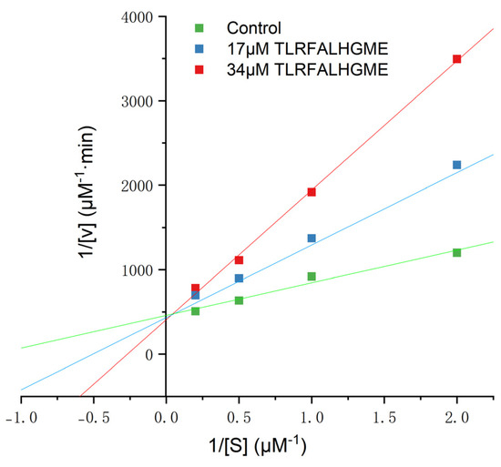 It has been reported that ACE-inhibitory peptides inhibit in different ways, including competitively, noncompetitively, and mixed-competitively [28]. Inhibition kinetics of TLRFALHGME were studied using Lineweaver–Burk plots. As shown in Figure 4, the slope changed while the y-intercept of 1/V remained unchanged for TLRFALHGME, suggesting that TLRFALHGME served as a competitive inhibitor by competing for the binding site on ACE. Kinetic studies indicated that TLRFALHGME possessed a competitive inhibition mode.