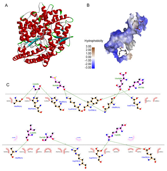 The molecular docking simulations of TLRFALHGME with ACE (PDB: 1O8A): (A) general overview and (B) the best-ranked docking pose of TLRFALHGME; (C) the interactions between TLRFALHGME and the residues of ACE.