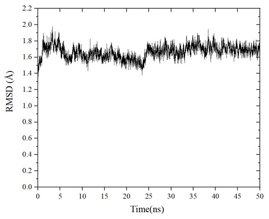 MD simulations were carried out to explore the stability of the binding tendency of the ACE–peptide complex. RMSD is an important parameter for measuring the stability of the protein–ligand complex [33]. It can be used to describe the conformational deviations during the dynamic simulation, which can reflect the stability of the ACE–peptide complex [34]. As shown in Figure 6, the root mean square deviation (RMSD) value of the ACE-TLRFALHGME complex fluctuated sharply in the early stages of the simulation and stabilized at around 0.16 nm to 0.18 nm after 25 ns. The result of the binding free energy calculation (MM/PBSA) is shown in Table 3. The total binding energy ΔGbinding was calculated as −82.7 ± 9.3 kJ·mol−1, indicating the favorable binding of TLRFALHGME with ACE. The contribution of van der Waals energy and electrostatic energy to the total binding energy were −104.7 ± 6.6 kJ·mol−1 and −409.2 ± 35.1 kJ·mol−1. Our results indicated that TLRFALHGME could bind ACE rapidly, forming a highly stable ACE-TLRFALHGME complex. The van der Waals and electrostatic interactions contributed to the maintenance of the stability of ACE-TLRFALHGME complexes, which agreed with the molecular docking simulation.