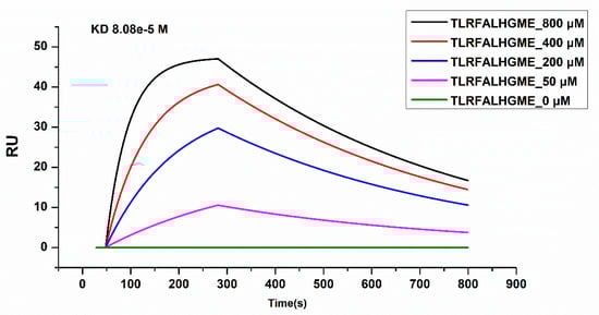 SPR was used to analyze the physical interactions between TLRFALHGME and ACE. SPR is an optical technique based on the detection of SPR biosensor chips and is widely used to characterize molecular interactions [35]. The binding affinity of the ACE–peptide complex was evaluated by determination of the binding affinity (KD) using SPR [36]. ACE was coupled with a sensor chip, and TLRFALHGME was added onto the chip at 0, 50, 200, 400, and 800 µmol·L−1 (Figure 7). Analysis of the sensogram was conducted to determine association and dissociation rate constants: Ka = 0.247 M−1 s−1 and Kd = 0.002 s−1. The KD value of the ACE-TLRFALHGME complex calculated from its kinetic parameters (Kd/Ka) is 80.9 μmol·L−1.