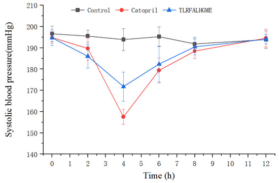 After intravenous administration of TLRFALHGME, antihypertensive effects were evaluated on spontaneously hypertensive rats (SHR). The SHR is the most widely used animal model for studying human essential hypertension [37]. As shown in Figure 8, TLRFALHGME had good effects on lowering blood pressure. A significant reduction in SBP was observed between 2 and 8 h (p < 0.05), with the lowest SBP of 171 mmHg occurring around 4 h after TLRFALHGME was administered. The SBP then recovered to 190 mmHg after 8 h.