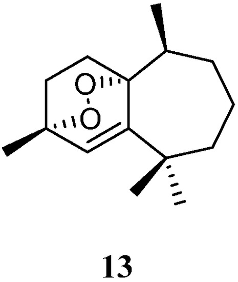 - Ghandourah, M.A.; Alarif, W.M.; Abdel-Lateff, A.; Al-Lihaibi, S.S.; Ayyad, S.-E.N.; Basaif, S.A.; Badria, F.A. Two new terpenoidal derivatives: A himachalene-type sesquiterpene and 13,14-secosteroid from the soft coral Litophyton arboreum. Med. Chem. Res. 2015, 24, 4070–4077. [Google Scholar] [CrossRef]