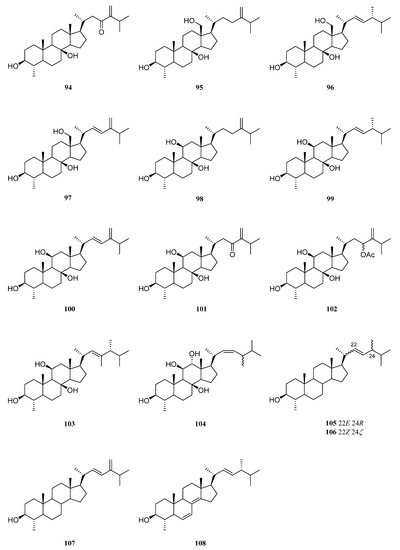 - Bortolotto, M.; Braekman, J.C.; Daloze, D.; Tursch, B.; Karlsson, R. Chemical studies of marine invertebrates. XXIX: 4α-methyl-3β,8β-dihydroxy-5α-ergost-24(28)-en-23-one, a novel polyoxygenated sterol from the soft coral Litophyton viridis, (Coelenterata, Octocorallia, Alcyonacea). Steroids 1977, 30, 159–164. [Google Scholar] [CrossRef]