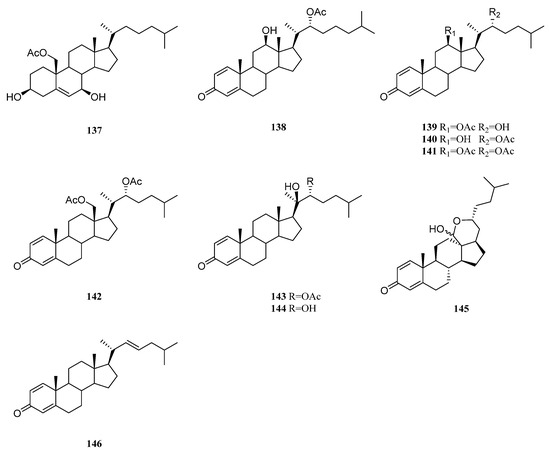- Zhang, J.; Liao, X.-J.; Wang, K.-L.; Deng, Z.; Xu, S.-H. Cytotoxic cholesta-1,4-dien-3-one derivatives from soft coral Nephthea sp. Steroids 2013, 78, 396–400. [Google Scholar] [CrossRef]