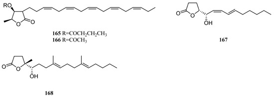 - Řezanka, T.; Dembitsky, V.M. γ-Lactones from the soft corals Sarcophyton trocheliophorum and Lithophyton arboreum. Tetrahedron 2001, 57, 8743–8749. [Google Scholar] [CrossRef]