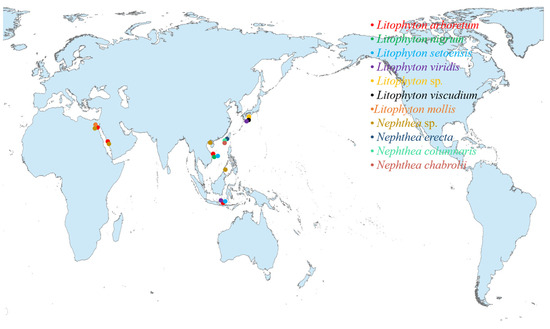 - van Ofwegen, L.P. The genus Litophyton Forskål, 1775 (Octocorallia: Alcyonacea: Nephtheidae) from Australia. Zootaxa 2020, 4764, 1–131. [Google Scholar] [CrossRef] [PubMed]