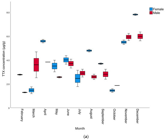 Kosker, A.R.; Karakus, M.; Katikou, P.; Dal, İ.; Durmus, M.; Ucar, Y.; Ayas, D.; Özogul, F. Monthly Variation of Tetrodotoxin Levels in Pufferfish (Lagocephalus sceleratus) Caught from Antalya Bay, Mediterranean Sea. Mar. Drugs 2023, 21, 527. https://doi.org/10.3390/md21100527