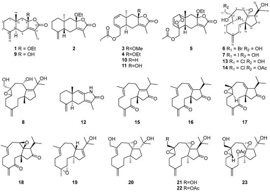 Although the natural product investigation of octacoral Clavularia spp. started last century [], new marine natural products have been successively identified from this genus to date [,,]. In the current study, 23 marine natural products, including eight new compounds, were identified. In view of chemical structure, the isolates can be divided into eudensamane-type sesquiterpene lactones (1–5 and 9–12) and dolabellane-type diterpenes (6–8 and 13–22). In terms of bioactivity, the dolabellane-type diterpenes demonstrate better cytotoxic activity than eudensamane-type sesquiterpene lactones. Our findings support our previous investigation and prove that the marine soft coral of the genus Clavularia is a rich source for the identification of cytotoxic compounds.