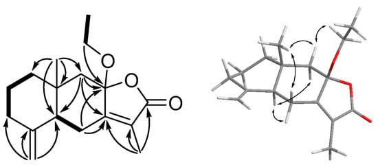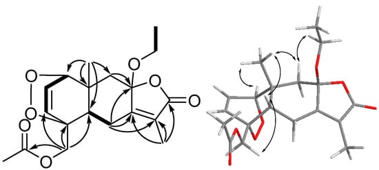 Clasamane E (5) was a colorless oil, and its HRESIMS data showed a [M + Na]+ ion at m/z 387.1414, suggesting the molecular formula of C19H24O7 with seven indices of hydrogen deficiency. The 1H and 13C data (Table 1 and Table 2) of 5 revealed typical signals of ethoxy (δH 3.46 (m), 3.15 (m) (H2-1′); δC 59.1 (C-1′); δH 1.21 (t) (H3-2′); δC 15.1 (C-2′)) and acetoxy (δC 170.7 (C-1″); δH 2.17 (s) (H3-2″); δC 20.8 (C-2″)) groups. A detailed analysis of COSY and HMBC spectra (Figure 3) established the planar structure of 5. In the COSY spectrum, proton spin systems of H-1 (δ 4.20)/H-2 (δ 6.74)/H-3 (δ 6.39) and H-5 (δ 2.53)/H2-6 (δ 2.61 and δ 2.47) were found. These two proton spin systems and the HMBC correlations from H3-14 (δ 1.61) to C-1 (δ 79.5), C-5 (δ 42.5), C-9 (δ 43.8), and C-10 (δ 38.7), from H2-15 (δ 4.43 and δ 4.37) to C-3 (δ 129.2), C-4 (δ 79.8), and C-5, from H2-9 (δ 2.26 and δ 1.40) to C-8 (δ 105.3), from H2-6 to C-7 (δ 155.8), C-8, and C-11 (δ 124.2), and from H3-13 (δ 1.79) to C-7, C-11, and C-12 (δ 171.0) can be used to assemble the framework of eudensamane-type sesquiterpene lactone. The HMBC correlations from H2-1′ to C-8 and from H2-15 to C-1″ indicated the connection of ethoxy and acetoxy groups, respectively. The above findings accounted for six of the seven indices of hydrogen deficiency, which implied an additional ring should exist in 5. Considering the molecular formula, two oxygen atoms were not assigned yet, and the carbon chemical shift of C-1 and C-4 suggested that these two carbons are oxygen bearing. Thus, a peroxide bridge between C-1 and C-4 was allocated. This assignment was also confirmed by the down-field shifted signals of H-2 and H-3 []. The cis-decalin moiety of 5 was assured by the NOESY correlations between H3-14 and H-5, which were assigned on the α-face. In addition, the NOESY correlations of H2-15/H-5 and H3-14/H-1 revealed the peroxide bridge was on the β-face of the molecule. The NOESY correlation of H-9β (δ 2.26)/H2-1″ indicated the β-orientation of the ethoxy group. Therefore, the stereocenters of 5 could be temporarily assigned as 1S*,4R*,5S*,8S*,10R* or 1R*,4S*,5R*,8S*,10S* (Figure S45). The 1H and 13C data of those two isomers were calculated by Gaussian 16, and the data were applied to DP4+ probability analysis. The analytic result indicated that the 1S*,4R*,5S*,8S*,10R* isomer has 100% possibility, so the configuration of 5 was determined.