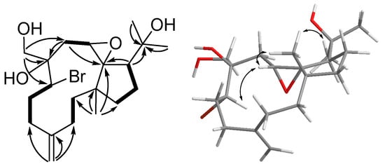 The planar structure of 6 was established by COSY and HMBC correlations (Figure 4). Three proton sequences of H2-2 (δ 1.96 and δ 1.25)/H2-3 (δ 2.11 and δ 1.63), H2-5 (δ 2.42 and δ 2.28)/H2-6 (δ 2.11 and δ 1.90)/H-7 (δ 4.04), and H2-9 (δ 2.25)/H-10 (δ 2.86) were observed from the COSY spectrum. Those findings and the HMBC correlation from H2-16 to C-3, C-4, and C-5; from H2-17 to C-7, C-8, and C-9; from H2-9 to C-8 and C-11; and from H3-15 to C-1, C-2, and C-11 could build the cycloundecane moiety (C-1 to C-11) of 6, and it could confirm the presence of exomethylene (H2-16) connecting at C-4, an oxymethylene attaching at C-8, and a methyl (H3-15) connecting at C-1. In addition, the COSY correlations of H-12 (δ 2.21)/H2-13 (δ 1.90 and δ 1.63)/H2-14 (δ 1.76) together with the HMBC correlations from H-12 to C-11 and from H3-15 to C-1, C-11, and C-14 could establish the cyclopentane ring of 6. The HMBC correlations from H-12 and the geminal methyls (H3-19 and H3-20) to C-3 constructed the isopropyl alcohol group. The planar structure of 6 was found to be similar to that of clavinflol B (13) except that the chlorine atom in the molecular formula (C20H33BrO4) of 13 was replaced by a bromine atom in 6. The halogen atom of 6 was allocated at C-7, the same as that of 13, due to the downfield shifted carbon chemical shift at this position (δ 66.2 in 13 and δ 63.0 in 6). The relative configuration of 6 was determined through the NOESY spectrum (Figure 4). The bromine atom was assigned on the α-orientation to avoid steric interaction, while the NOESY correlations of H-7/H-10/H3-15/H3-19 indicated those protons were on the β–face of the molecule. On the other hand, the NOESY correlation between H2-17 and H2-9 implied that the hydroxy group should be β-oriented. Therefore, the configuration of 6 could be defined as 1R*,7R*,10S*,12R*. The configuration of C-8 was deduced to be 8R by the DP4+ probability measurement. The 1R*,7R*,8R*,10S*,12R* isomer showed an overwhelming possibility (100%) compared with the 1R*,7R*,8S*,10S*,12R* isomer (0%), which confirmed the configuration of 6.