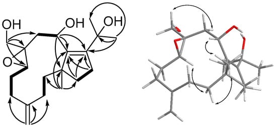 Clabellane C (8) has the molecular formula C20H32O4 (IHD = 5), as deduced from HRESIMS and NMR spectrometric data. The IR spectrum of 8 indicated the presence of hydroxy (3378 cm−1) and exomethylene (1643 cm−1) functionalities. The 1H and 13C NMR data of 8 were analogous to those of 6, suggesting it is also a dolabellane-type diterpenoid. Four proton sequences of H2-2 (δ 1.74 and δ 1.32)/H2-3 (δ 2.04 and δ 1.79), H2-5 (δ 2.46 and δ 2.27)/H2-6 (δ 1.96 and δ 1.49)/H-7 (δ 3.13), H2-9 (δ 2.58 and δ 1.96)/H-10 (δ 4.37), and H2-13 (δ 2.35 and δ 2.20)/H2-14 (δ 1.74 and δ 1.43) were observed by the cross-peaks in the COSY spectrum. Moreover, the above finding and the HMBC correlations from H2-16 (δ 4.71 and δ 4.67) to C-3 (δ 29.9), C-4 (δ 150.3), and C-5 (δ 28.7); from H2-17 (δ 3.98 and δ 3.32) to C-7 (δ 60.2), C-8 (δ 63.8), and C-9 (δ 37.8); from H-10 to C-1 (δ 53.1), C-11 (δ 141.2), and C-12 (δ 144.7); from H3-15 (δ 1.05) to C-1 (δ 53.1), C-2 (δ 35.7), C-11, and C-14 (δ 32.7); and from H3-19 (δ 1.35) to C-12, C-18 (δ 72.3), and C-20 (δ 29.7) could establish the planar structure of 8. Three hydroxy groups allocated at C-10 (δ 65.0), C-17 (δ 68.6), and C-18 were assured by virtue of their downfield shifted carbon chemical shifts. The aforementioned data accounted for four of the five indices of hydrogen deficiency, suggesting an additional ring remained in 8. An epoxy group was assigned to C-7 and C-8 by their downfield shifted carbon chemical shifts. Therefore, the planar structure was established. The relative configuration of 8 was determined by interpretation of NOESY data (Figure 5) and DP4+ probability analysis. The NOESY correlation of H-10/H3-15/H-2β (δ 1.74) indicated the β-orientation of these protons. The presence of NOESY cross-peaks between H-7 and H-2α (δ 1.32) indicated they are α-orientated. The configuration assignment was confirmed by the 100% possibility of DP4+ analysis. On the basis of the data described above, the configuration of 8 was established to be 1S*,7S*,8R*,10S*.