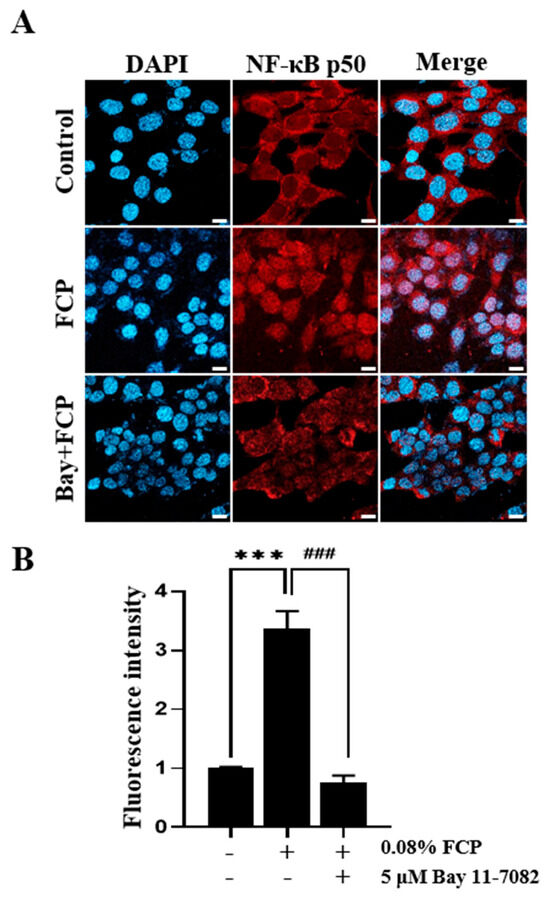 Inhibitory effects of Bay 11-7082 on the FCP-induced activation of NF-κB signaling. (A) Fluorescent staining and confocal laser scanning microscopy demonstrated that Bay 11-7082 inhibited the FCP-induced translocation of NF-κB p50 to the nucleus (blue: DAPI; red: NF-κB p50). (B) A bar graph represents the measured staining intensity of NF-κB p50 translocation. All data are expressed as relative values against their respective control group. The data represent the mean ± standard deviation of three independent experiments; *** p < 0.001 (vs. the control group); ### p < 0.001 (vs. 0.08% FCP group). Scale bars = 25 µm.