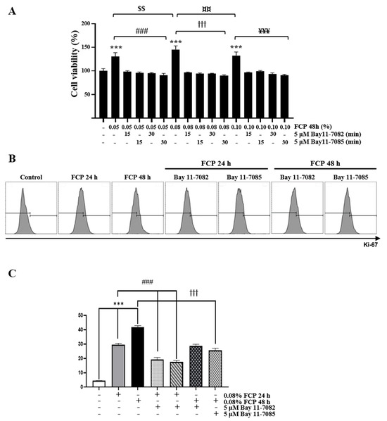 Next, a CCK-8 cell proliferation assay was used to evaluate the ability of FCPs to facilitate cell proliferation. The treatment of TECs with FCPs for 48 h significantly promoted cell proliferation at concentrations of 0.05%, 0.08%, and 0.1% by 30.5% (p < 0.001), 45.4% (p < 0.001), 32.7% (p < 0.001), respectively, compared with the control (Figure 3A). To determine whether FCP-mediated TEC proliferation could be regulated by NF-κB signaling pathways, the TECs were stimulated with 0.05%, 0.08%, and 0.1% FCP for 48 h with or without Bay 11-7082 and Bay 11-7085. Consequently, based on the CCK-8 assay results, we found that FCP-induced cell proliferation was completely abolished by 5 µM Bay 11-7082- and Bay 11-7085-mediated NF-κB signaling inhibition (Figure 3A). In consistence with this finding, we also observed that the expression of Ki-67 in TECs by flow cytometry following incubation with 0.08% FCP for 24 and 48 h was increased by 6.7-fold (p < 0.001) and 9.4-fold (p < 0.001), respectively, whereas this FCP-induced increase in Ki-67 expression was effectively abrogated by the treatment with 5 µM of both Bay 11-7082 and Bay 11-7085 (Figure 3B). Taken together, these results confirmed that FCPs trigger cell proliferation through the NF-κB signaling pathway in TECs.