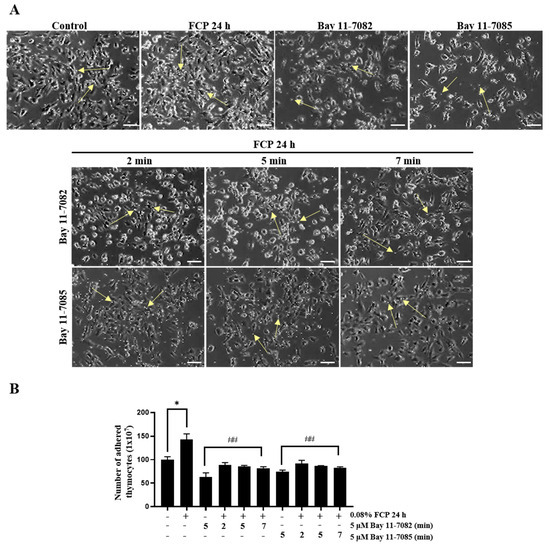 Quantitative adherence assay of thymocytes to TECs. The TECs were pretreated with 5 μM Bay 11-7082 or 11-7085 for 2, 5, and 7 min prior to seeding freshly isolated thymocytes onto the layer of TECs in 0.08% FCP-containing media for 24 h. (A) Representative photomicrographs of thymocytes (arrows) adhered to TECs. Treatment with 0.08% FCP for 24 h exhibited a significant increase in the number of adherent thymocytes, whereas this effect of FCPs was fully abrogated by Bay 11-7082 and Bay 11-7085. (B) A bar graph showing the number of adhered thymocytes. The data are expressed as the mean ± SD; * p < 0.05 (vs. the control group); ## p < 0.001 (vs. 0.08% FCP group). Scale bars = 50 µm.