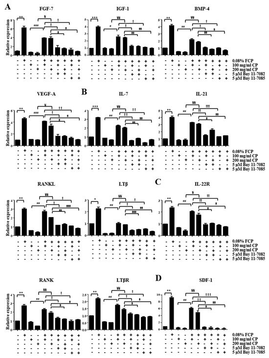 The treatment of CP (100 and 200 mg/mL)-pretreated TECs with 0.08% FCP for 48 h increased the IL-7 gene expression by 2.6-fold (p < 0.01) and 3.0-fold (p < 0.01), respectively, compared with that in the CP-treated group (Figure 6B). This upregulated IL-7 gene expression in the CP and FCP co-treated group was fully reversed by the addition of Bay 11-7082 and Bay 11-7085 (Figure 6B). The treatment of CP (100 and 200 mg/mL)-pretreated TECs with 0.08% FCP for 48 h increased the IL-21 gene expression by 4.3-fold (p < 0.01) and 3.8-fold (p < 0.01), respectively, compared with that in the CP-treated group (Figure 6B). This upregulated IL-21 gene expression in the CP and FCP co-treated group was fully abrogated by the addition of Bay 11-7082 and Bay 11-7085 (Figure 6B). The treatment of CP (100 and 200 mg/mL)-pretreated TECs with 0.08% FCP for 48 h increased the RANKL gene expression by 4.6-fold (p < 0.01) and 5.4-fold (p < 0.01), respectively, compared with that in the CP-treated group (Figure 6B). This upregulated RANKL gene expression in the CP and FCP co-treated group was fully obliterated by the addition of Bay 11-7082 and Bay 11-7085 (Figure 6B). The treatment of CP (100 and 200 mg/mL)-pretreated TECs with 0.08% FCP for 48 h increased LTβ gene expression by 6.5-fold (p < 0.01) and 5.4-fold (p < 0.01), respectively, compared with that in the CP-treated group (Figure 6B). This upregulated LTβ gene expression in the CP and FCP co-treated group was fully abolished by the addition of Bay 11-7082 and Bay 11-7085 (Figure 6B).