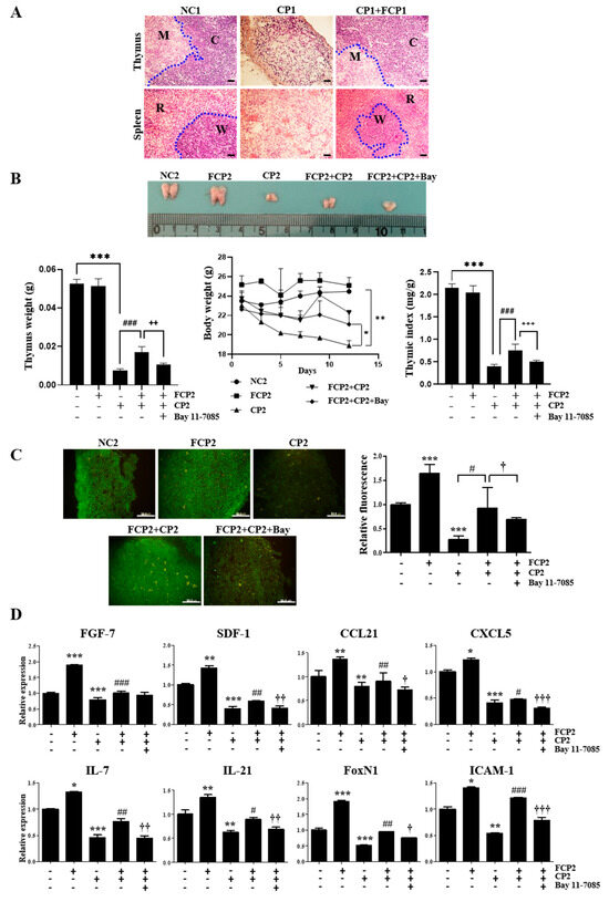 Protective effect of FCPs against CP-induced injury in mice model. (A) Representative HE staining of the thymus and spleen sections from the NC1, CP1, and FCP1+CP1 groups. C, cortex; M, medulla; R, red pulp; W, white pulp. (B) The thymus size, mice body weight, and thymic index. (C) Representative immunofluorescence staining of thymus sections to detect CD4 expression (green), and (D) bar graphs represent the mRNA relative expression levels of FGF-7, SDF-1, CCL21, CXCL5, IL-7, IL-21, FoxN1, and ICAM-1, normalized to GAPDH, from NC2, FCP2, CP2, FCP2+CP2, and FCP2+CP2+Bay groups. The data shown are means ± standard deviation; * p < 0.05, ** p < 0.01, *** p < 0.001 (vs. the NC2 group); # p < 0.05, ## p < 0.01, ### p < 0.001 (vs. the CP2 group); † p < 0.05, †† p < 0.01, ††† p < 0.001 (vs. FCP2+CP2 group). Scale bars = 50 µm (both in (A) and (C)).