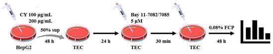 The treatment of CP (100 and 200 mg/mL)-pretreated TECs with 0.08% FCP for 48 h increased CD40 gene expression by 4.7-fold (p < 0.01) and 4.3-fold (p < 0.01), respectively, compared with that in the CP-treated group (Figure 6F). This upregulated CD40 gene expression in the CP and FCP co-treated group was fully obliterated by the addition of Bay 11-7082 and Bay 11-7085 (Figure 6F). The treatment of CP (100 and 200 mg/mL)-pretreated TECs with 0.08% FCP for 48 h increased CD80 gene expression by 4.6-fold (p < 0.01) and 4.5-fold (p < 0.01), respectively, compared with that in the CP-treated group (Figure 6F). This upregulated CD80 gene expression in the CP and FCP co-treated group was fully reversed by the addition of Bay 11-7082 and Bay 11-7085 (Figure 6F). The treatment of CP (100 and 200 mg/mL)-pretreated TECs with 0.08% FCP for 48 h increased CD86 gene expression by 4.4-fold (p < 0.01) and 4.1-fold (p < 0.001), respectively, compared with that in the CP-treated control (Figure 6F). This upregulated CD86 gene expression in the CP and FCP co-treated group was fully abrogated by the addition of Bay 11-7082 and Bay 11-7085 (Figure 6F).