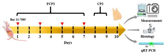 First, the administration of FCPs robustly elevated the level of FGF-7 gene expression by 1.9-fold in the FCP2 group compared with the NC2 group (p < 0.001), whereas in the CP2 group, CP administration significantly reduced the level of FGF-7 gene expression compared with the NC2 group (Figure 7D). In the FCP2+CP2 group, the treatment of CP-pretreated mice with FCPs increased FGF-7 gene expression by 1.3-fold (p < 0.001) compared with that in the CP2 group (Figure 7D). This upregulated FGF-7 gene expression in the FCP2+CP2 group was reversed by the treatment with Bay 11-7085 (Figure 7D).