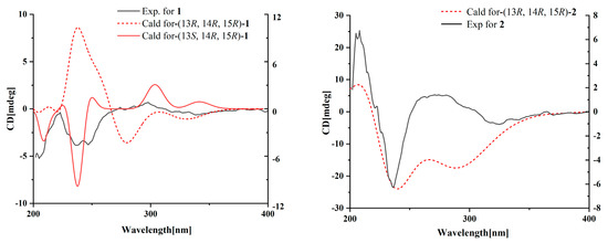 Compound 2 was isolated as a yellow oil. The HRESIMS (m/z 347.1609 [M − H]−, calcd for C20H24NO6−, 374.1609) data suggested a molecular formula of C20H25NO6, revealing nine degrees of unsaturation. The NMR signals (Table 1) of 2 resembled those of 1, except for the absence of a methoxyl group at δC/H 49.5/3.26. Large coupling (J = 15.6 Hz) between H-6 (δH 6.25) and H-7 (δH 5.74) showed that the ∆6(7) olefinic bond was in E-configuration. NOESY data of H3-1 (δH 1.65)/H-4 (δH 5.93), H-4 /H-6 and H2-9 (δH 2.40)/H3-21 (δH 1.75), indicated that the ∆2(3), ∆4(5) and ∆10(11) olefinic bonds were all in E-configuration. The NOESY spectrum of 2 showed key correlations of H3-18/H-14, indicating that they were co-facial. The high similarity between the calculated ECD curve of (13R, 14R, 15R)-2 and its experimental curve unambiguously confirmed the absolute configuration of 2 (Figure 2) [18,19,20].