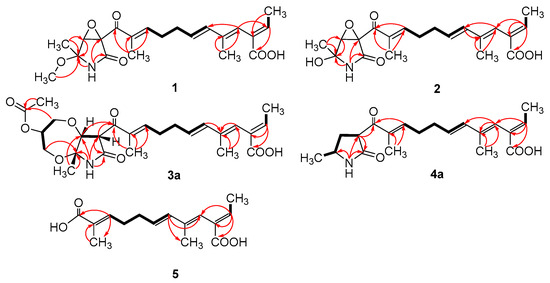 Key COSY (bold lines) and HMBC (arrows) correlations of compounds 1–5.