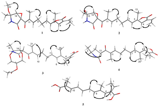 Key NOESY (double arrow) correlations of compounds 1–5.