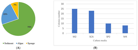 Moreover, previous studies showed that the composition of culture media significantly affected the number and diversity of Actinobacteria strains [26,27,28]. Therefore, to enhance the isolation of Actinobacteria from the three marine sources, four culture media were used. The results indicated that SCA and M2 were the most efficient culture media for actinomycete isolation since 25 and 23 actinomycete strains were obtained from each culture medium, respectively. However, ISP2 and M4 provide only 10 and 8 Actinobacteria strains, respectively (Figure 1B).