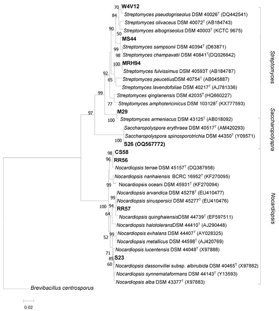 Partial 16S rRNA gene sequencing was used to identify 19 Actinobacteria strains that exhibit the highest antimicrobial activity against the tested microorganisms. By using BLAST analysis, the obtained sequences were compared to the closest homologous sequences. The results of molecular identification, shown in Supplementary Table S2, indicated that the identified isolates shared sequence similarities that ranged from 99 to 100% with 3 different Actinobacteria genera, including Streptomyces (11 strains), Nocardiopsis (7 strains), and Saccharopolyspora (1 strain). Previous studies indicated that the genera Streptomyces, Nocardiopsis, and Saccharopolyspora have been widely isolated from different marine sources, which were collected from distinct geographical locations, including marine sediments [30], marine sponges [31,32], marine invertebrates such as corals [33] and molluscs [34], and algae [16]. After the molecular identification of the 19 active strains, 9 actinobacterial isolates, which exhibited the best antimicrobial activity against the pathogenic microorganisms, were selected for phylogenetic study. This aimed to determine the phylogenetic relationships between the selected strains and the closest species. The results are shown in Figure 2. The obtained dendrogram differentiated the nine selected strains into three clusters. In fact, the strains V17, CS44, RH94, and S29, were spread in four different phyletic lines within the Streptomyces group, and they showed 99.50%, 99.30%, 99.75%, and 99.75% of sequence similarity, with type strains, Streptomyces sampsonii DSM 40394, Streptomyces pseudogriseolus strain NRRL B-3288, Streptomyces fulvissimus strain DSM 40593, and Streptomyces armeniacus DSM 43125, respectively. However, the isolates C19, CHB2, A58, and M23, which belong to the Nocardiopsis cluster (Figure 2), form three separated branches within the phylogenetic tree and are close to the species Nocardiopsis terrae YIM 90022 (99.30% similarity), Nocardiopsis arvandica DSM 45278 (100% similarity), and Nocardiopsis dassonvillei IMRU 509 (99.75% similarity), respectively. Strain S26 forms a separate clade, and it is close to the species Saccharopolyspora erythraea, with 99.70% similarity.