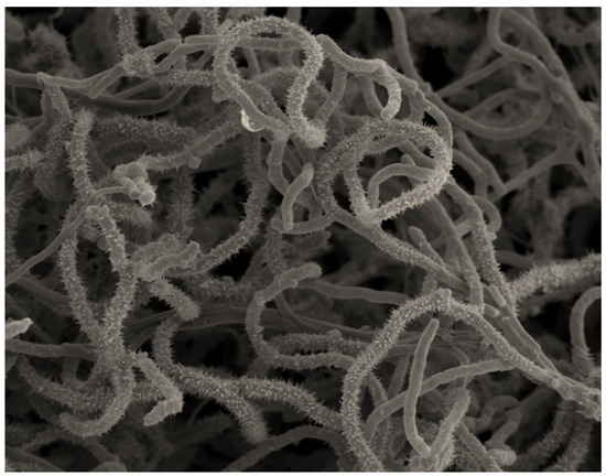 The selected strain S26 was identified as belonging to the genus Saccharopolyspora, which includes 46 species with validly published names (LPSN: https://www.bacterio.net, accessed on 12 October 2023). The genus Saccharopolyspora is a member of the family Pseudonocardiaceae, order Actinomycetales, and phylum Actinobacteria. Molecular identification indicated that this strain was close to the species Saccharopolyspora erythraea DSM 40517T. Strains of this species are characterized by the formation of long spore chains that are surrounded by a spiny surface sheath. However, the other species belong to the Saccharopolyspora genus and form a smooth surface sheath [35]. Therefore, in order to verify whether the micromorphology of strain S26 is identical to the type strain Saccharopolyspora erythraea DSM 40517T or not, scanning electronic microscopy was performed. The results (Figure 3) indicate that the strain S26 forms a branched substrate mycelium that is fragmented at maturity into coccoid and bacillary elements. The aerial mycelium of S26 forms a spore chain surrounded by a spiny sheath (Figure 3), and this micromorphology is typical of strains belonging to the species of Saccharopolyspora erythraea [35]. In addition, other similarities have been noted between the strain S26 and the species Saccharopolyspora erythraea, such as the use of different carbon sources by the isolate S26 being perfectly the same as that of the species Saccharopolyspora erythraea, except for the raffinose and the cellulose, which are not used by strain S26 (Supplementary Table S3 and Figure S1C). Furthermore, both strain S26 and the closest species, Saccharopolyspora erythraea, secreted a bright red soluble pigment, and they do not produce melanoid pigments (Supplementary Figure S1A). However, some macromorphological differences between S26 and Saccharopolyspora erythraea have been noted. In fact, the aerial mycelium of S26 is beige-brown, whereas it is usually white to pink for the species Saccharopolyspora erythraea [36]. More characteristics of strain S26 can be found in Supplementary Table S3.