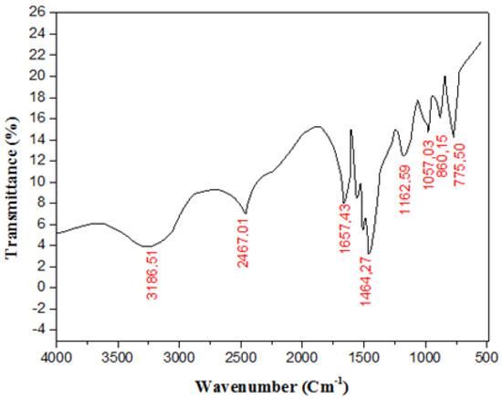 The FTIR spectrum is a valuable tool for identifying functional groups and chemical bonds. According to the FTIR spectrum presented in Figure 4, four characteristic absorption bands appeared at four different positions, namely 775.50 cm−1, 860.15 cm−1, 1162.59 cm−1, and 1464.27 cm−1, which are attributed to the carbonate groups (CO32−) in BioAg2CO3NPs [38,39]. Therefore, the FTIR spectrum (Figure 4) conveniently demonstrates the presence of CO32−, within the nanoparticles biosynthesized by the biomass of strain S26. In addition, the IR spectrum of BioAg2CO3NPs exhibited peaks at 3186.51 cm−1 and 2467.01 cm−1, corresponding to OH and N–H vibrations, respectively. These peaks indicate the presence of a surface-bound bio-organic phase that acts as a capping/stabilizing agent on the surface of the synthesized nanoparticles [40]. These organic agents have a significant impact on the chemical, physical, and biological features of the nanoparticles [41].