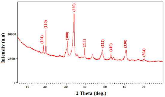 The X-ray diffraction (XRD) analysis was performed in order to examine the crystallographic structure as well as to determine the size of BioAg2CO3NPs synthesized using the biomass of strain S26. The obtained results are shown in Figure 5.