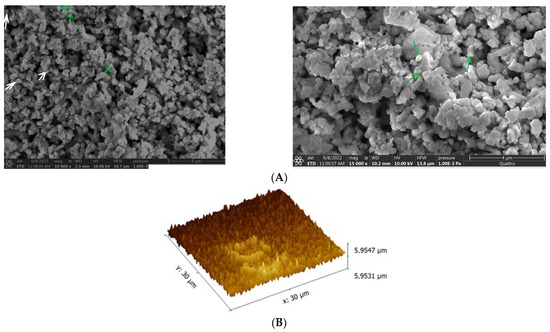 Microscopic analysis through SEM of silver carbonate nanoparticles biosynthesized using the biomass of strain S26 unveiled diverse morphological shapes and uniform distribution, with only a minor presence of particle aggregation (Figure 7A). The prevalent form observed was triangular (indicated by the green arrow) (Figure 7A), while other shapes, such as rectangular (indicated by the white arrow) and spherical, were also detected (Figure 7A). Moreover, the SEM results indicated that the average size of Bio Ag2CO3NPs ranges from 90 nm to 110 nm, thus confirming the findings from the X-ray diffraction data (Figure 6). Various parameters, including the preparation process, the strain used for synthesis, and the culture conditions such as pH and temperature, exert a significant influence on the morphology and size of the synthesized nanoparticles [50].