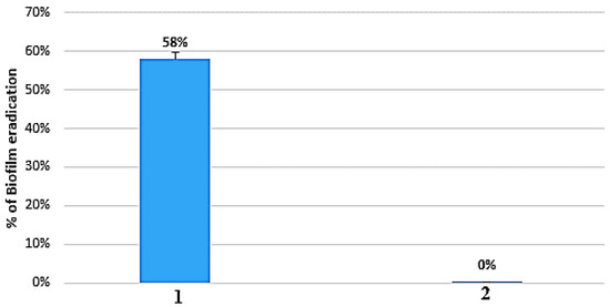 To quantify microbial adhesion, the stain in the wells was diluted with 200 μL acetic acid in water (33%), and the absorbance was measured at 595 nm with a microplate reader. Percentages of reduction in biofilm structures were calculated using the formula [79]: