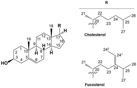 Chemical structural formulas depicting cholesterol, a representative sterol, and fucosterol, utilized as the initial material for the organic synthesis of novel secosteroids. Numbers indicate carbon positions. Cholesterol and fucosterol have a common cholestane skeleton. “R” indicating a different side chain binds to this skeleton.