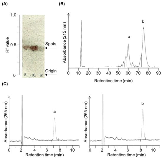 Chromatogram profiles illustrating the chromatographic separation of target compounds 3 and 4. The reaction solution was concentrated following the reaction shown in Figure 7e. (A) The concentrated product contained a constituent with an Rf value of 0.43 upon expansion in acetic ether/normal hexane (1:4, v/v) during silica gel thin-layer chromatography. Column chromatography eluted and recovered this fraction in acetic ether/normal hexane (3:7, v/v). (B) Further purification using reverse-phase HPLC (condition 1) yielded two prominent peaks around 60.1 min (peak a) and 75.4 min (peak b). (C) HPLC chromatograms (condition 2) of purified peak a (left panel, compound 4) and peak b (right panel, compound 3).