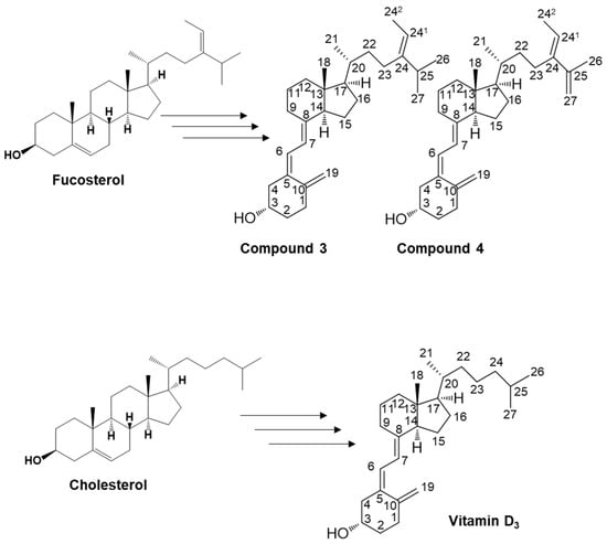 Although compound 3 was synthesized organically, it could occur naturally. Notably, information about vitamins D4–D7 in natural products is scarce. Vitamins D4 and D5 were identified in mushrooms in 2012 [] and in Arabidopsis mutants in 2018 [], respectively, and 7-dehydrositosterol, a vitamin D5 precursor, was found in red algae [] and Indian snakewood, which is used medicinally [,]. Vitamin D6 and D7 precursors, 7-dehydrostigmasterol and 7-dehydrocampesterol, respectively, exist in protozoa [,]. If UV exposure affects these precursors, vitamins D6 and D7 could be present. The precursor of compound 3, 7-dehydrofucosterol, naturally occurs and is found in sponges [,,,], water molds [], and protozoa []. Exposure to UVB could lead to the production of compound 3. Future research may uncover 7-dehydrofucosterol’s presence in food and compound 3’s occurrence in natural products.
