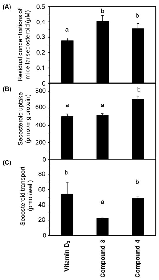Comparative depiction of secosteroid intestinal absorption using differentiated Caco-2 cell monolayers. Cells were exposed to mixed micellar secosteroid in Transwell plates for 24 h. (A) Remaining concentrations of secosteroid in the mixed micelles (apical side). (B) Uptake of secosteroid by differentiated Caco-2 cells forming the tight monolayer. (C) Quantities of secosteroid transported from the tight monolayers into the basolateral medium. Data represent means ± standard deviations from four wells in a Transwell plate for a single experiment. Replicate experiments exhibited consistent trends. Values sharing a common alphabet were statistically indistinct, as determined by the Mann–Whitney U-test (p < 0.05).